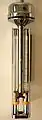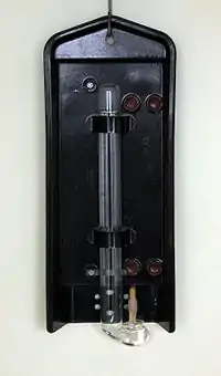В аспирационном психрометре (например, психрометре Ассмана[5][44][45][43]) одинаковые ртутные термометры расположены в специальной никелированной оправе, защищающей их от повреждений и теплового излучения окружающих предметов, где обдуваются потоком исследуемого воздуха с постоянной скоростью около 2 м/с за счёт просасывания (аспирации) воздуха посредством механического или электрического вентилятора. Перед работой тканевую ленту влажного термометра смачивают дистиллированной водой из специальной пипетки с резиновой грушей; при продолжительных измерениях увлажнение периодически повторяют[45]. Снимают показания сухого и влажного термометров и находят относительную влажность либо по психрометрической таблице[46], либо по психрометрическому графику[47][48] или номограмме[49]. Всемирная метеорологическая организация для вычисления относительной влажности воздуха по результатам замеров, выполненных с помощью психрометра Ассмана, рекомендует использовать следующую формулу[50], учитывающую влияние атмосферного давления: