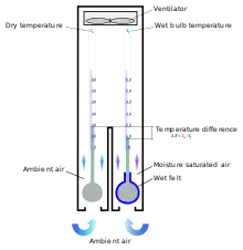 Испарение воды приводит к её охлаждению, тем большему, чем меньше влажность воздуха, контактирующего с водой. По разнице температур воздуха (называемой в психрометрии температурой сухого термометра) и поверхностного слоя воды (называемой температурой влажного термометра, или температурой смоченного термометра[2], или температурой мокрого термометра[3]) можно определить влажность воздуха. При этом приходится учитывать то обстоятельство, что испарившаяся влага остаётся в окрестностях датчика температуры (например, колбы влажного жидкостного термометра), локально увеличивая там влажность воздуха. Для устранения этого эффекта при измерении влажности применяют аспирацию, обдувая термометры анализируемым газом (воздухом)[4].