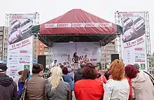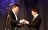 Народный артист России саксофонист Игорь Бутман вручает звезду «Status Media» в номинации «Деятель культуры» руководителю хореографического ансамбля «Солнышко» Ирине Белотеловой. Псков, 2012 год.