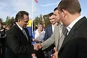 Главред ПЛН Александр Савенко (в центре) и губернатор Псковской области Андрей Турчак (справа) приветствуют министра спорта России Виталия Мутко. Псков, 2009 год.