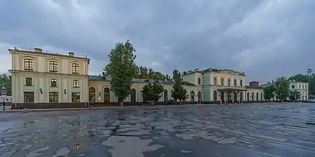Средняя часть в виде выступающего ризалита с мезонином является центральным ядром всей композиции, а также отмечена и функционально: именно здесь расположен основной вход в вокзал. По обе стороны от него тянутся одноэтажные крылья, занятые помещениями для пассажиров. Крылья завершают сильно выступающие в сторону площади два ризалита, которые ограничивают и уравновешивают собой объёмную композицию, а также образуют небольшое по отношению к общей длине в плане каре. Таким образом, здание вокзала имеет три поперечных оси: по центральной части и по боковым ризалитам, объёмы которых не только выдвинуты в плане относительно линии основных крыльев, но и имеют высотные подвышения в виде мезонинов. Причем довольно большая высота боковых ризалитов и центра позволила разбить боковые объёмы на три этажа.