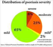 Псориаз обычно классифицируют по степени тяжести на лёгкий (с поражением менее 3 % поверхности кожи), средней тяжести (с поражением от 3 до 10 процентов поверхности кожи) и тяжёлый (с вовлечением более 10 процентов поверхности кожи). Псориатическое поражение суставов расценивается как тяжёлая форма псориаза, вне зависимости от площади поражения кожи. Существует несколько шкал для оценки степени тяжести псориаза. Оценка степени тяжести заболевания в целом базируется на оценке следующих факторов: площадь поражения (процент поверхности тела, вовлечённый в процесс), степень активности заболевания (степень красноты, отёчности, гиперемии псориатических бляшек или пустул, степень выраженности кожного зуда, степень утолщения кожи, степень шелушения, наличие кровоточивости или экссудации, вторичного инфицирования бляшек, степень припухлости и болезненности суставов), наличие общих симптомов активности процесса (таких, как повышенная утомляемость, повышенная СОЭ, повышенный уровень мочевой кислоты в анализах крови и т. п.), ответ больного на предшествующие попытки лечения, влияние заболевания на общее состояние и повседневную жизнь больного, на его социальное функционирование.