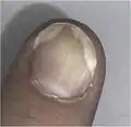 Псориаз ногтей, или псориатическая ониходистрофия (L40.86) приводит к разнообразным изменениям внешнего вида ногтей на пальцах рук или ног. Эти изменения могут включать в себя любую комбинацию изменения цвета ногтей и ногтевого ложа (пожелтение, побеление или посерение), появления на ногтях и под ногтями точек, пятен, поперечной исчерченности ногтей линиями, утолщения кожи под ногтями и вокруг ногтевого ложа, расслоения и утолщения ногтя, полной утраты ногтей (онихолизис) или развития повышенной ломкости ногтей.