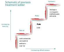 При лечении лёгких форм псориаза дерматологи стремятся использовать наименее токсичные средства и методы лечения, имеющие наименьший риск возможных побочных эффектов. Если поставленные цели лечения не достигнуты, могут быть испробованы другие методы лечения, потенциально более эффективные, но обладающие большей потенциальной токсичностью и имеющие более высокий риск серьёзных побочных эффектов. Лекарства и методы лечения, имеющие значительную токсичность и высокий риск серьёзных побочных эффектов, при этом обычно резервируются для случаев тяжёлого и при этом резистентного к другим, менее токсичным, методам лечения псориаза. Это называется «лестница терапевтических мероприятий»[49].