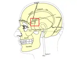 Расположен на 3 см кзади и несколько кверху от скулового отростка лобной кости, на границе соединения четырёх костей: