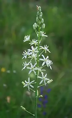 Кисть многоцветковая, 10—25 см длиной, в молодости плотная, пирамидальная, после вытянутая, цилиндрическая, рыхлая. Цветоножки после цветения прямые, более или менее прижатые к стеблю; изредка цветоножки дуговидные и кисть с меньшим количеством цветов. Прицветники ланцетные, длинно-заострённые, нижние в 2—3 раза короче цветоножек. Листочки околоцветника продолговато-ланцетные, 12—14 мм длиной, тупые, белые, посредине с зеленоватой более или менее широкой полоской. Тычинки по длине равны половине околоцветника. Коробочка яйцевидная, трёхгранная, 1,5 см длиной, створки слабо выпуклые. Цветение в июне—июле.
