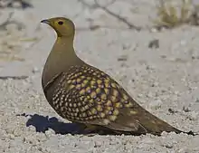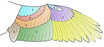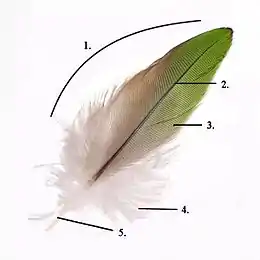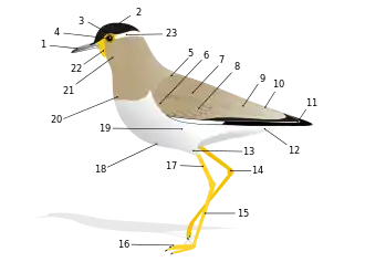1. Клюв 2. Голова 3. Радужная оболочка 4. Зрачок 5. Спина 6. Малые кроющие крыла 7. Плечо 8. Кроющие второстепенных маховых 9. Кроющие первостепенных маховых 10. Надхвостье 11. Первостепенные маховые 12. Подхвостье 13. Бедро 14. Предплюсневой сустав 15. Цевка 16. Пальцы 17. Голень 18. Брюхо 19. Бок 20. Грудь 21. Горло 22. Серёжка