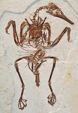 Самыми ранними известными представителями клады Avialae могут быть птицеподобные динозавры Anchiornis huxleyi, Xiaotingia zhengi, Aurornis xui и Eosinopteryx brevipenna, известные по окаменелостям из верхнеюрской (около 160 млн лет назад) формации Тяоцзишань в Китае[30][32]. Впрочем, их родственные связи малопонятны; согласно другим исследованиям, эти виды не входят в Avialae[31][33], а самые базальные известные представители группы — скансориоптеригиды[33], жившие примерно в то же время, археоптерикс[31], живший примерно на 10 млн лет позже, или другие таксоны[63]. Эти ранние формы обладали необычными анатомическими особенностями, которые в ходе дальнейшей эволюции птиц были утеряны[30].