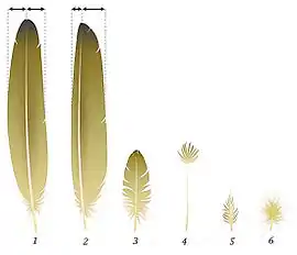 По мере обнаружения всё большего количества ископаемых нелетающих теропод, имеющих большее или меньшее родство с современными птицами, граница между «птицами» и «не-птицами» становится всё более размытой, и дать определение птиц всё сложнее[29]. Ранее одним из их определяющих признаков считалось наличие перьевого покрова[39], но ряд находок конца XX — начала XXI веков в китайской провинции Ляонин показал, что перья имели и многие мелкие тероподы, например синозавроптерикс[40] и синорнитозавр[41][42]. Самым ранним из известных «перьев», вероятно, является позднеюрская окаменелость, описанная под названием Praeornis sharovi[43][44]. Эволюционное происхождение перьев можно проследить начиная с таких крупных теропод, как карнотавр, покрытого многочисленными бугорками[45], похожими на фолликулы. Следующий этап виден у синозавроптерикса и Dilong paradoxus, покрытых волокнистым пухом[45]. Наконец, у каудиптерикса, протархеоптерикса, синорнитозавра, микрораптора и Changyuraptor yangi уже были настоящие перья[45].