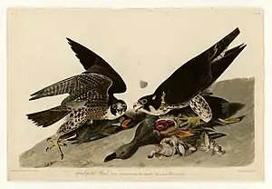 В конце октября 1826 года друзья в Эдинбурге познакомили Одюбона с гравёром Вильямом Лизарсом. Лизарс унаследовал от отца печатный бизнес и к моменту встречи уже участвовал в создании двух книг по орнитологии: Illustrations of British Ornithology (1821—1834) Прайдокса Джона Селби и Illustrations of Ornithology (1825—1843) Селби и Уильяма Джардина[78][79]. Несколько дней он рассматривал работы Одюбона, акцентируя внимание на крупных птицах, и, увидев портрета сапсана (Falco peregrinus), принял решение о публикации[78].