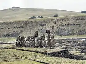 ![]() На переднем плане каменные истуканы. На заднем плане вулкан Пука-КаТики. (28 марта 2004 г.). | |