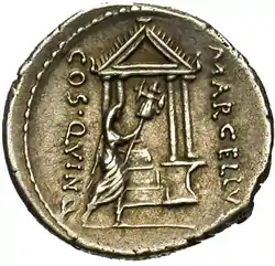 Изображения на этом денарии связаны с деятельностью самого известного представителя семьи Марцеллов — Марка Клавдия Марцелла. Символ Сицилии трискелис на аверсе указывает на взятие Сиракуз в 212 году до н. э. после двухлетней осады во время II Пунической войны. Храм на реверсе связан с посвящением в храм Юпитера Феретрия доспехов (лат. Spolia opima), снятых с убитого консулом в поединке вождя галлов Бритомара (или Виридомара)[8][9] во время войны против племён бойев и инсубров[10].