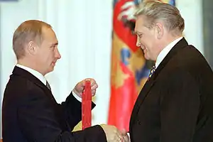 ![]() Владимир Путин вручает Николаю Пугину орден «За заслуги перед Отечеством» II степени (20 сентября 2000) | |
