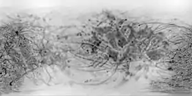 ![]() Кратер Пуйл на снимке «Галилео». Прямо под крестом из борозд наверху расположен Коннемарский хаос. | |