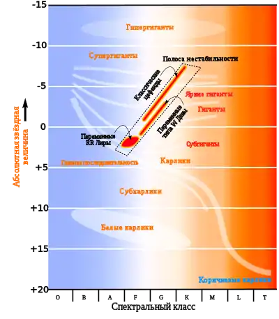 Один из важнейших типов пульсирующих переменных звёзд — цефеиды. Эти звёзды — сверхгиганты спектральных классов F—K с периодами обычно от 1 до 50 суток и амплитудами — 0,1—2,5m. Для цефеид существует зависимость между периодом и светимостью[10], которая позволяет использовать их как стандартные свечи: из периода цефеид можно определять их абсолютную звёздную величину, и, сравнивая последнюю с видимым блеском, вычислять расстояние до звезды[11][12]. Благодаря высокой светимости, цефеиды наблюдаются не только в нашей, но и в других галактиках[13].