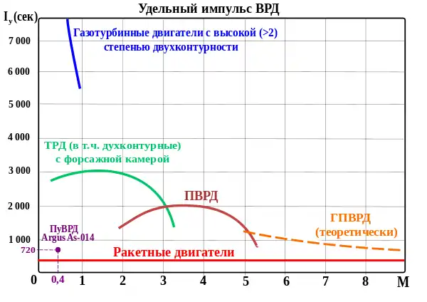 Функционирование двигателя в этом случае объясняется следующим образом. Когда давление в камере после очередного импульса снижается до атмосферного, движение газа в сопле по инерции продолжается, и это приводит к понижению давления в камере до уровня ниже атмосферного. Когда воздушный клапан открывается под воздействием атмосферного давления (на что тоже требуется некоторое время), в камере уже создано достаточное разрежение, чтобы двигатель мог «вдохнуть свежего воздуха» в количестве, необходимом для продолжения следующего цикла.[6] Ракетные двигатели помимо тяги характеризуются удельным импульсом, являющимся показателем степени совершенства или качества двигателя. Этот показатель является также мерой экономичности двигателя. В приведённой ниже диаграмме в графической форме представлены верхние значения этого показателя для разных типов реактивных двигателей, в зависимости от скорости полёта, выраженной в форме числа Маха, что позволяет видеть область применимости каждого типа двигателей.