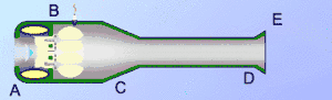 - 2. Топливная смесь воспламеняется и сгорает, давление в камере сгорания резко возрастает и закрывает воздушный клапан и обратный клапан в топливном тракте. Продукты сгорания, расширяясь, истекают из сопла, создавая реактивную тягу.