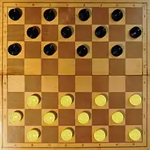 Доска 8×8 клеток располагается между партнёрами таким образом, чтобы слева от играющего находилось тёмное угловое поле. В начальной позиции у каждого игрока по 12 шашек, расположенных в первых трёх рядах на чёрных клетках.
