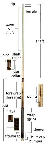 Наклейка кия не должна быть изготовлена из материала, который может поцарапать или повредить ударяемый шар. Она должна быть сделана из куска особым образом выделанной кожи или другого волокнистого или пластичного материала, который продолжает естественный профиль шафта кия.