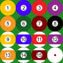 Полный комплект шаров состоит из одного битка белого цвета и пятнадцати пронумерованных цветных шаров особых цветов. Прицельные пронумерованы от 1 до 15. Прицельные шары с номерами от 1 до 8 имеют сплошную окраску в следующие цвета: 1 — жёлтый, 2 — синий, 3 — красный, 4 — фиолетовый/пурпурный, 5 — оранжевый, 6 — зелёный, 7 — тёмно-коричневый, 8 — чёрный. Прицельные шары с номерами от 9 до 15 — белые с центральной полосой с тем же порядком цветов, что и в первой восьмёрке (то есть следующих цветов: 9 — белый с жёлтой полосой, 10 — белый с синей полосой, и т. д.)