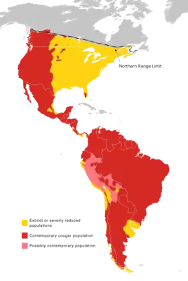 Исторически ареал пумы был самым обширным среди всех наземных млекопитающих Америки. Даже сейчас по широте распространения пума сравнима (из кошачьих) только с обыкновенной рысью, рыжей рысью, лесной кошкой и леопардом. Первоначально пумы встречались почти повсеместно от юга Патагонии до юго-востока Аляски; область её распространения достаточно точно совпадала с ареалом её главной добычи — различных оленей. Сейчас на территории США и Канады пума сохранилась преимущественно в гористых западных районах. На востоке Северной Америки пума была практически полностью истреблена; исключение составляет крохотная популяция подвида Puma concolor coryi во Флориде.