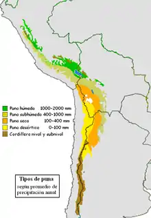 Растительность на обширных пространствах почти отсутствует. Встречаются кустарники (ярета (Azorella compacta), парастефия (Parastrephia spp.), в том числе тола (Parastrephia lepidophylla), эскаллония (Escallonia spp.) и др.), дерновинные злаки (ковыли, овсяница, вейник). На склонах гор до высоты 4500 м встречаются древесные виды полилеписа (кеньюра) (Polylepis spp.)[1][2]. На территории пун располагаются многочисленные вулканы, имеются богатые месторождения олова, вольфрама, сурьмы, цинка, серебра[2].