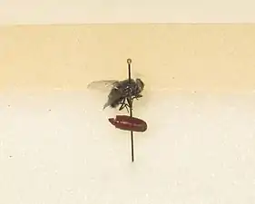 Имаго и пупарий Calliphora vicina; обратите внимание на «крышечку» пупария