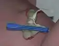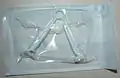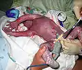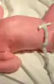 Пластиковый зажим наложенный на пуповину со стороны новорождённого вместо перевязки