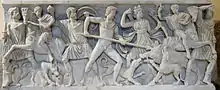 Произведения демонстрируют и отличное знание работ Рафаэля на ту же тему, причём Пуссен даже воспроизвёл круглую форму щитов. Ю. Золотов отмечал, что «Битвы» характерны ещё и главенством декоративного принципа. Фигуры на холсте как бы выводятся на плоскость силуэтами, создавая причудливый узор. Единство композиции определяется одинаковым цветом обнажённых фигур воинов, что в известной степени близко решениям школы Фонтенбло. Однако это могло быть и влиянием Россо Фьорентино, тосканского живописца, который работал в Фонтенбло[60]. Существует также версия, что на Пуссена глубокое впечатление произвёл саркофаг Людовизи, обнаруженный в 1621 году, об этом как будто бы свидетельствуют некоторые параллели. Это позволило художнику придать фигурам выразительность. В эрмитажной картине группа трёх воинов на переднем плане слева воплощает энергию и решимость, ей соответствуют обнажённый воин с мечом и фигуры, движущиеся от центра вправо на московском полотне. Пуссен не пожалел сил на изображение многообразия мимики, что позволило передать состояние аффекта, но главным образом настроение создают вариации поз и движения[61]. При этом воодушевление воинов не ассоциируется со внешним религиозным импульсом, а их отваге чужда экзальтация. Такого образного решения не предложил ни один из предшественников Пуссена ни во Франции, ни в Италии. В то же время в «Битвах» сильно барельефное начало, что, по-видимому, не случайно: Пуссена привлекла возможность продемонстрировать анатомические познания. Однако вынесение всей композиции на передний план делало невозможным использование центральной перспективы[62].