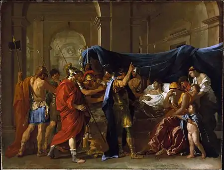 Сюжет картины «Смерть Германика» основан на второй книге «Анналов» Тацита: славный полководец пал в Сирии от яда завистливого императора Тиберия. Пуссен избрал для сюжета момент, когда друзья клянутся своему начальнику не мстить, а жить по справедливости. Эта картина знаменует поворотный момент в творчестве Пуссена, в дальнейшей античная тема неизменно подавалась им в моральном измерении. Решение сюжета было целиком авторское, античных атрибутов здесь представлено немного[68]. Рентгенограмма картины показала, что сначала Пуссен хотел поднять фигуры на подиум колонного храма, но затем отказался от этой идеи. Первоначальный графический набросок с этим решением сохранился в Берлине. Окончательным центром композиции стал сам Германик, к которому обращены все остальные фигуры, их жесты и движения (у изголовья — жена и дети, слева — воины). Действие вновь вынесено на передний план, отделённый от внутреннего пространства синим пологом. Фигуры размещены свободно, а интервалы между ними ритмически выразительны. Пологу вторит строгость архитектурного фона, но показательно, что Пуссен не вполне справился с перспективным построением: правая стена как бы вывернута (по Ю. Золотову) на плоскость, а капители пилястров размещены несообразно замковому камню арки. Введение полога, по-видимому, означало, что художник осознал ненужность воссоздания дворцового пространства[69]. Существует также версия, что на ритмическое построение композиции сильно повлиял так называемый «Саркофаг Мелеагра», который Пуссен мог видеть на Римском Капитолии[70].