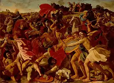 Первые сохранившиеся римские полотна Пуссена являются батальными сценами, хотя и основанными на ветхозаветных сюжетах. Две такие картины находятся в Москве и Петербурге, сюжет московской картины основан на библейской истории Нав. 10:10-13, в которой Иисус Навин остановил Солнце над Гаваоном и Луну над долиной Авалонской. Именно поэтому на полотне показаны оба светила, а световое решение сделано чрезвычайно контрастным. «Битвы» настолько отличались от прочих римских произведений Пуссена, что выдвигались теории, что он исполнил их ещё во Франции. Действительно, некоторые позы и фигуры исполнены очень похоже на некоторые из виндзорских рисунков. Переполнение переднего плана фигурами также не характерно для более позднего творчества художника[60].
