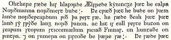 Ōhthere sǣde his hlāforde, Ælfrēde cyninge, ðæt hē ealra Norðmonna norþmest būde. Hē cwæð þæt hē būde on þǣm lande norþweardum wiþ þā Westsǣ.