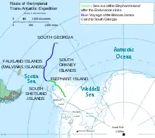 5 декабря 1914 года «Эндьюранс» под командованием Шеклтона покинул Южную Георгию — самый южный форпост человечества на пути к шестому континенту, на котором находились несколько китобойных станций, таких как норвежские Грютвикен, Стрёмнесс и Хусвик. Несмотря на крайне сложную ледовую обстановку в этом секторе Антарктики летом 1915 года, Шеклтон смог пройти более 1000 миль практически неисследованного моря Уэдделла, прежде чем его корабль оказался в плену дрейфующих льдов и к 19 февраля застрял в них окончательно на 76°34′ ю. ш. и 31°30′ з. д. всего в одном дне плавания от конечной цели путешествия[1]. Шеклтон писал: