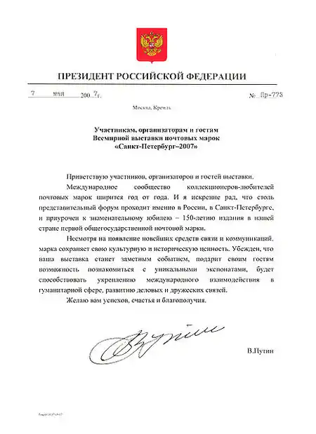 - Обращение Президента РФ Путина В. В. (недоступная ссылка — история ). Пресс-центр. Приветствия участникам. Всемирная выставка почтовых марок «Санкт-Петербург—2007»; Почта России. Дата обращения: 10 августа 2010.