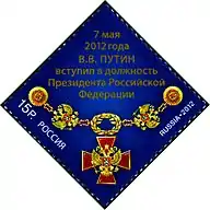 После победы Владимира Путина на президентских выборах 2012 года была выпущена почтовая марка, приуроченная к его вступлению в должность президента Российской Федерации. На марке номиналом 15 рублей размещён памятный текст и изображён Знак Президента Российской Федерации. Марка была выпущена тиражом в 630 000 экземпляров. Художник марки — А. Московец. Марочные листы включали 9 (3 × 3) марок[3].