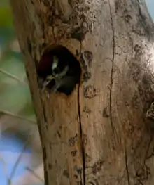 Дупло устраивается в стволе или боковой ветви мёртвого дерева, либо по крайней мере в мёртвой его части, активно поражённой грибком. Как правило, выбираются лиственные породы с не очень широким стволом — осина, берёза и др. Иногда птицы устраивают гнездо в телеграфных столбах и других искусственных сооружениях. Место для дупла обычно выбирает самка; выдалбливанием занимаются поочерёдно обе птицы пары в продолжение 13—20 суток. Высота дупла над поверхностью земли обычно составляет от 3,5 до 9 м, нередко оно расположено в нескольких сантиметрах книзу от обрубленного конца ствола. Откладка яиц в южной части ареала в апреле — мае, в северной в мае — июне. В кладке, как правило, 3—6 (в среднем 4,8) белых блестящих яиц, но в северной части может быть и больше — до 7-и штук[5][3].