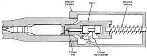 Принцип действия автоматики пушки основан на отдаче затвора и опережающем воспламенении капсюля[3]. В основу работы системы со свободным затвором и опережающим воспламенением положено инициирование капсюля в момент времени, соответствующий движению затвора вперед. При таком способе оружие функционирует из положения открытого затвора, в этом случае патронник пуст, а затвор находится в крайнем заднем положении. При выстреле затвор освобождается из заднего положения, захватывает патрон из магазина и начинает досылать патрон в патронник. Ещё до окончания досылания патрона производится ударное воспламенение капсюля, при этом патрон и затвор продолжают движение вперед[4]. Давление пороховых газов достигает максимума в тот момент, когда патрон полностью находится в патроннике и гильза полностью опирается о стенки каморы. Для обеспечения максимального опирания гильзы в системах с опережающим воспламенением используется гильза с параллельными стенками. Давление пороховых газов должно быть достаточно низким для предотвращения случаев разрыва гильзы при экстракции.