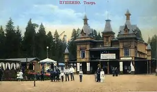 В 1880 году недалеко от станции был разбит общественный парк, который стал излюбленным местом отдыха пушкинских дачников. Центром культурной жизни дачного поселка стал построенный в этом же году, в центре парка, летний театр (сгорел в 1894 году). В 1896 году на средства страхового общества «Якорь» в парке был выстроен новый летний театр (архитектор А. Н. Кнабе), сгоревший летом 1993 года. Пушкино занимает особое место в истории театрального искусства. На рубеже XIX—XX века здесь жили и творили всемирно известные актёры, режиссёры и драматурги: К. С. Станиславский и В. И. Немирович-Данченко проводили на пушкинском дачном участке Архиповых первые репетиции будущего Московского Художественного театра[52], их ученик Всеволод Эмильевич Мейерхольд оттачивал принципы преобразования театрального реализма в ходе летних репетиций «Театра-студии» в Мамонтовке[53], создатель особой теории театральности Николай Николаевич Евреинов, впервые познакомившись с театром в Пушкино, написал здесь свои первые произведения[54], а основоположник грузинского театра Котэ Марджанишвили жил здесь во время работы над постановкой «Гамлета» в МХТ[55].