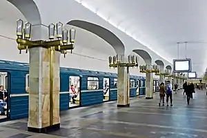 Что касается цветовой гаммы, то потолок и большая часть стен оформлены в белом цвете, колонны частично мраморные бежевые со специфическими переливами. На станции чувствуется просторность, общая обстановка немного торжественная[4].