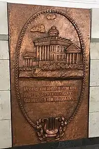 Пушкинская тема в оформлении прослеживается в ярких медных чеканках, расположенных на путевых стенах — по четыре на каждой[12]. Чеканки посвящены Москве (две чеканки), Санкт-Петербургу, Царскосельскому лицею, имению Михайловское, могиле поэта в Святогорском монастыре и поэтическому дару поэта (две чеканки). Каждое изображение сопровождается строками из произведений поэта.