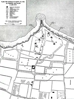 ![]() Карта Пуэнт-дю-Ок с обозначением немецких укреплений и 155-мм орудий | |||