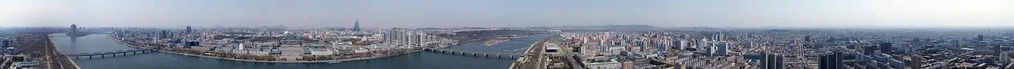 ![]() По часовой стрелке, начиная с правого верхнего угла: Монумент идей чучхе, Триумфальная арка, Гробница короля Тонмёна, станция Пухын Пхеньянского метрополитена, Арка Воссоединения, Кымсусанский дворец Солнца, вид из гостиницы Янгакдо через реку Тэдон на Политехнический университет имени Ким Чхэка в западной части города | |||
