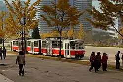 Также в городе действует троллейбусный и трамвайный транспорт. Троллейбусное движение было открыто 30 апреля 1962 года[4]. Трамвайное движение существовало до Корейской войны 1950—1953, после которой трамвай не восстанавливался. Современная трамвайная система Пхеньяна была построена «с нуля», трамвайное движение открылось спустя почти три десятилетия после пуска троллейбуса, 12 апреля 1991 года[4].