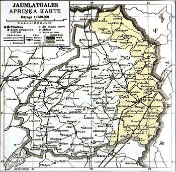 В 1933 году посёлок Яунлатгале получил статус города[2][4]. Его население было многонациональным и многоконфессиональным. По состоянию на 1935 год в Яунлатгале проживали русские (626 чел., или 50,4 % из 1242 жителей), латыши (479 чел., или 38,6 %), евреи (61 чел., или 4,9 %), белорусы (25 чел., или 2,0 %), поляки (24 чел., или 1,9 %), эстонцы (10 чел., или 0,8 %), немцы, литовцы и др.[28] На конец 1935 года в городе насчитывалось 114 домов — 105 одноэтажных и 9 двухэтажных (среди них было 6 кирпичных домов, 103 деревянных и 5 смешанных). Действовали государственная гимназия, двухгодичная сельскохозяйственная школа, латышская и русская основные школы.