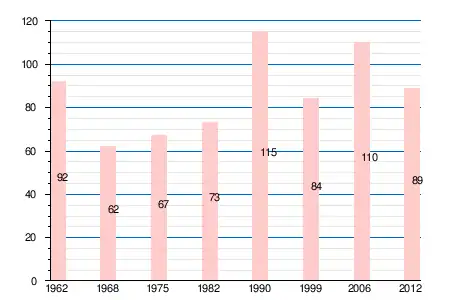 | 1962 | 1968 | 1975 | 1982 | 1990 | 1999 | 2006 | 2011 | 2012 |