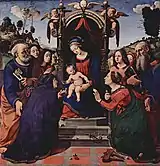 Мистическое обручение святой Екатерины Александрийской. Мария с Младенцем, ангелы, святая Екатерина Александрийская, святая Роза из Витербо, святые Пётр и Иоанн Креститель. 1493. Дерево, масло. Музей Оспедале дельи Инноченти, Флоренция