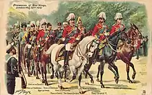 - Во главе процессии следуют новый английский король Георг V и многие европейские монархи, включая кайзера Вильгельма II в форме британского фельдмаршала (это звание было пожаловано ему в 1901 году королём Эдуардом).