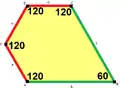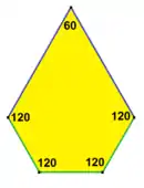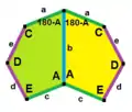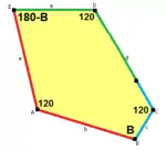 ![]() a = d = e, b = c B + D = 180°, 2B = E | ![]() a = d = e, b = c B = 60°, A = C = D = E = 120° | ![]() b = c = d = e B + 2E = 2C + D = 360° | ![]() b = c = d = e 2B + C = D + 2E = 360° | |