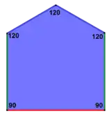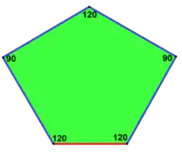 ![]() 2a = 2c = d = e A = 90°, B ≈ 145,34°, C ≈ 69,32°, D ≈ 124,66°, E ≈ 110,68° (2B + C = 360°, C + E = 180°). | ![]() a = c = e, b = 2a A = 150°, B = 60°, C = 135°, D = 105°, E = 90° | |