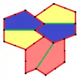 ![]() Замощение плоскости одной пятиугольной плиткой (типа 3) через формирование регулярной мозаики из шестиугольников (каждый из которых разбивается на 3 пятиугольника) |